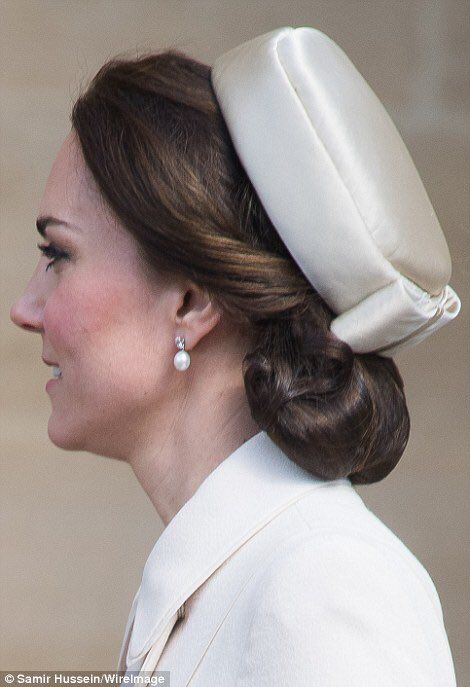Romantic braided updos or low hair updos are Kate’s go to hairstyle when it comes to looking extra glamorous. She likes to keep her hair off her face in tidy buns or medium tight braids. As you may have guessed, our favorite looks is the one with pearl details. You can also try this look by keeping your swirly hairstyle in place with elegant pearl-accented bobby pins. You’ll look very chic!